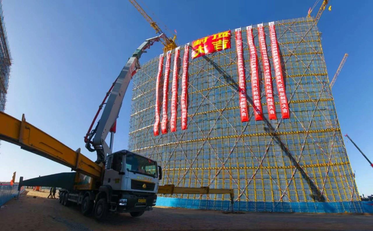 冬日寒風(fēng)凜冽,但擋不住建設(shè)者奮戰(zhàn)的熱情。氣化裝置建設(shè)現(xiàn)場條幅高懸,炮聲不斷,充滿了喜慶的氛圍。11 月 28 日,氣化框架迎來重要里程碑——41.46m 喜迎混凝土封頂。泵車伸出長長的臂膀,把混凝土罐車拉來的混凝土送入氣化框架 41.46m 頂部。此次澆筑工程規(guī)模大,共需澆筑 685 立方米混凝土,現(xiàn)場投入2 臺 72 米泵車協(xié)同作業(yè),經(jīng)過連續(xù) 11 小時的奮戰(zhàn),最終成功完成澆筑任務(wù)。